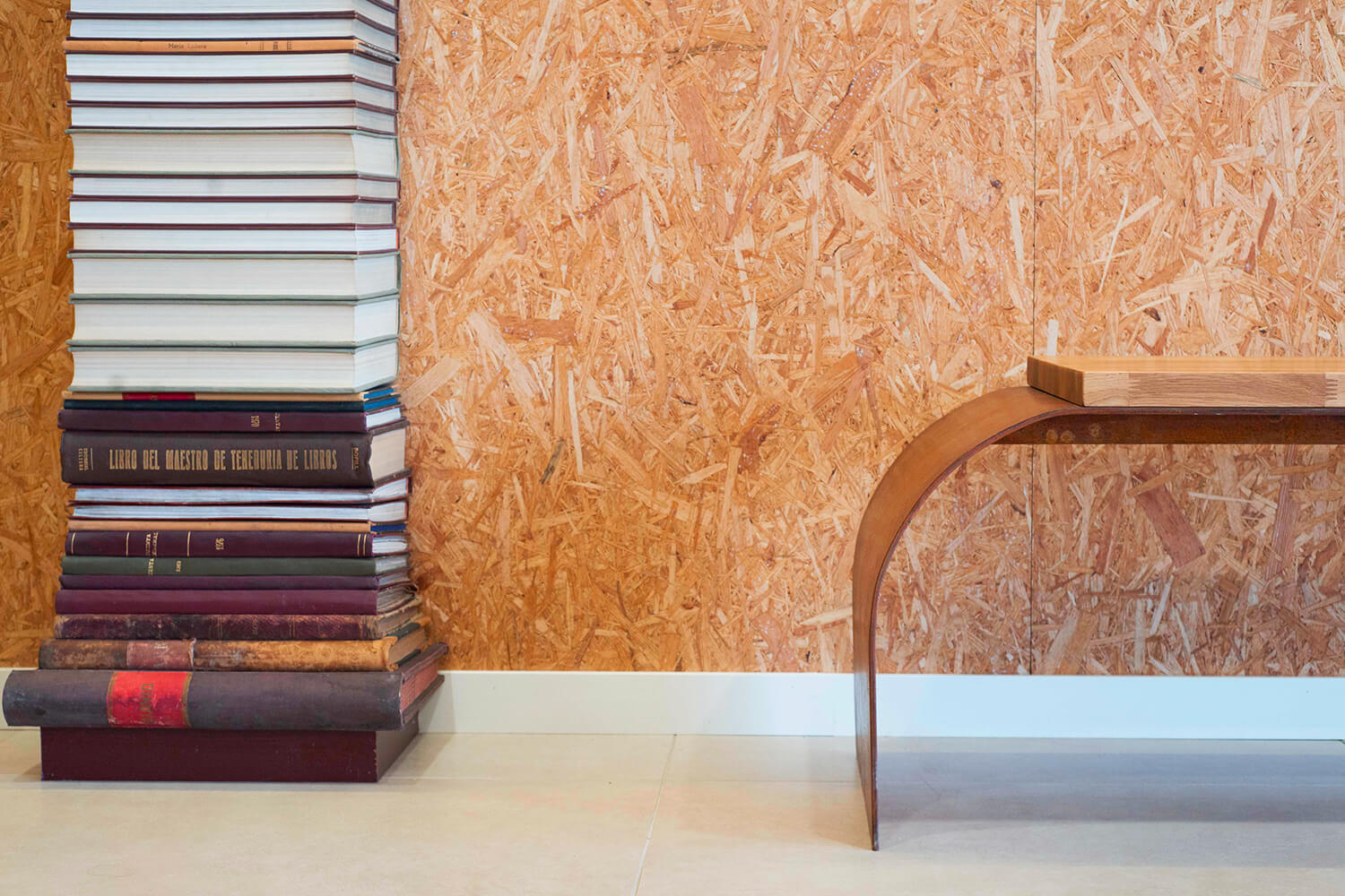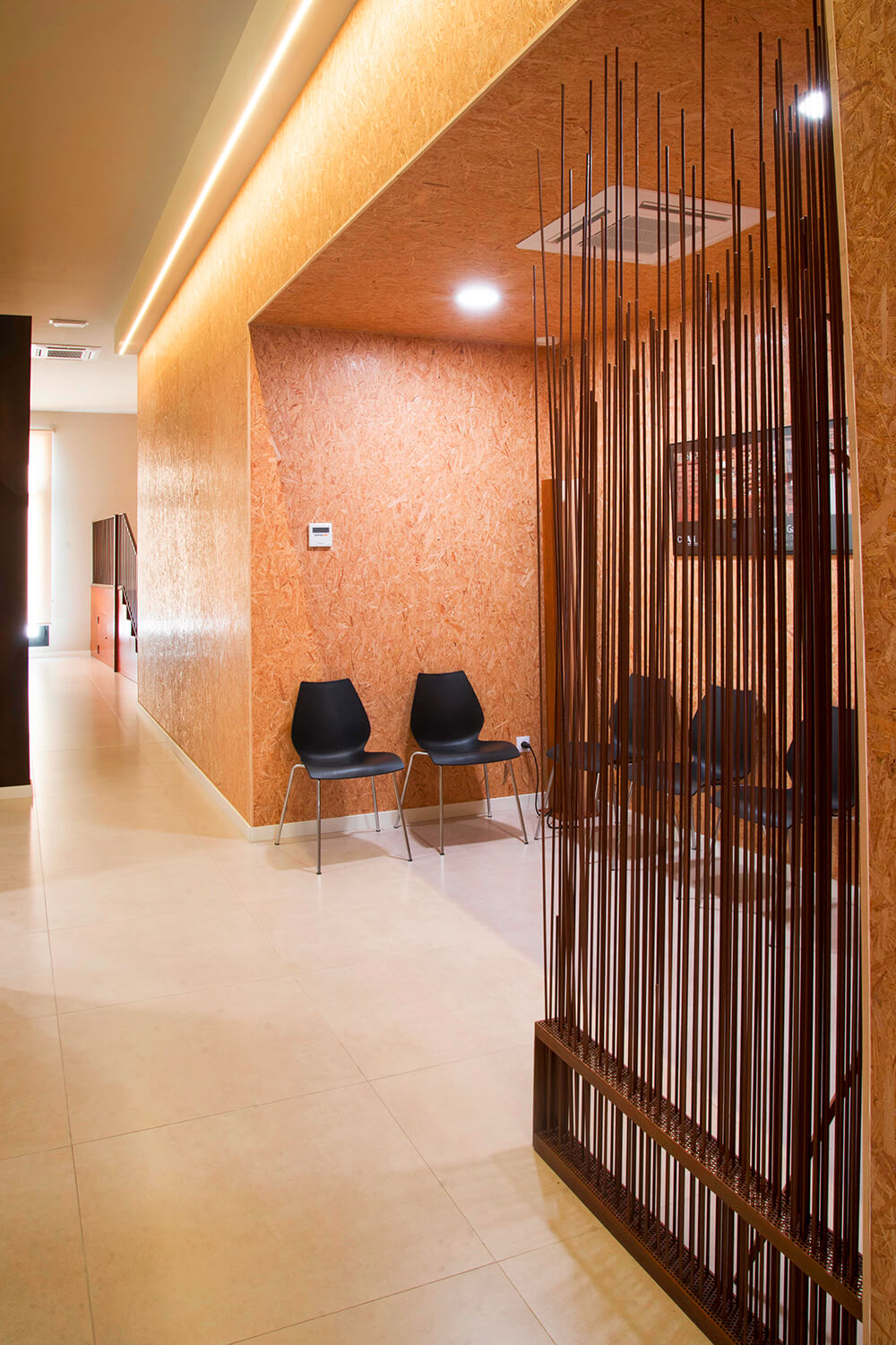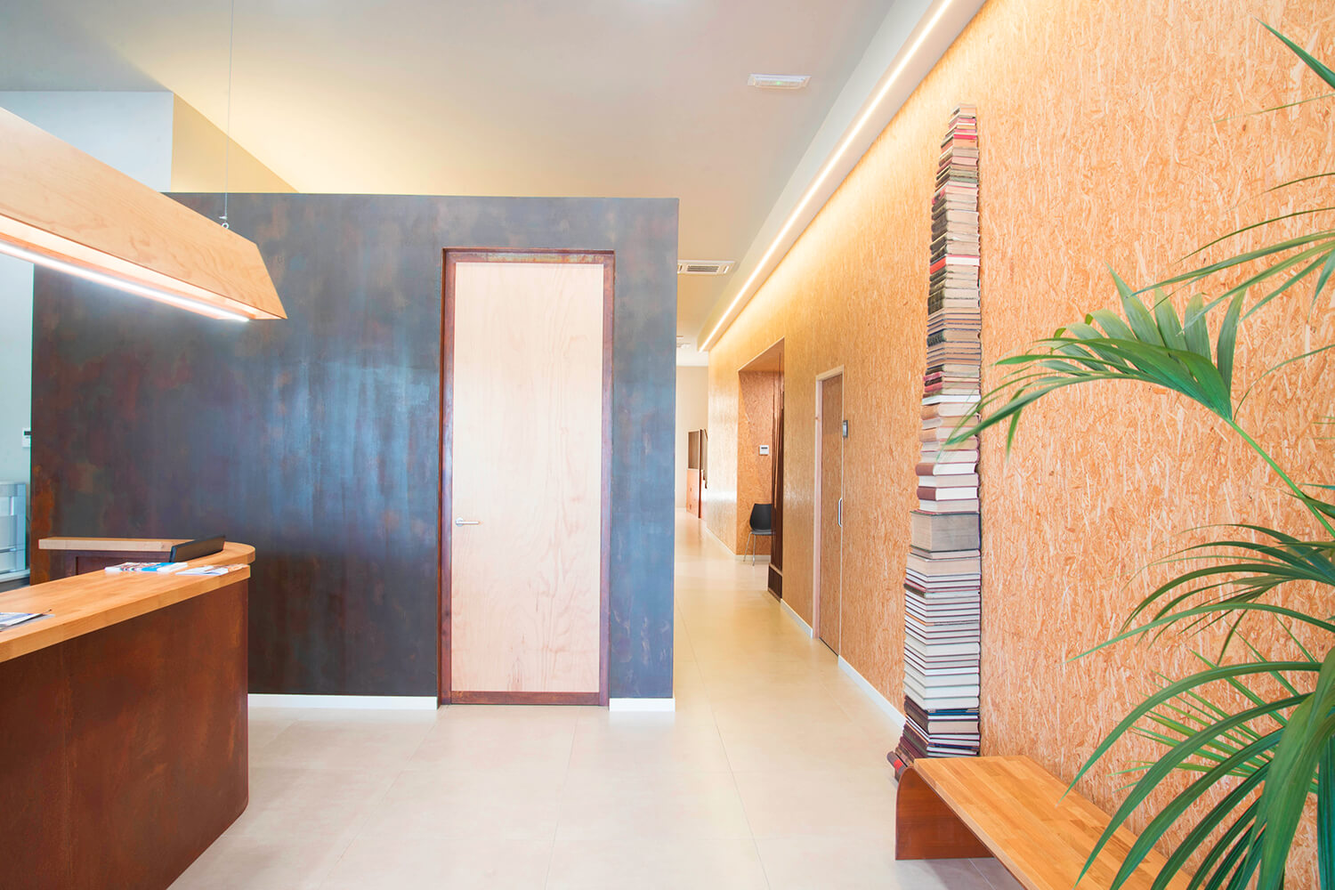 Así, para el proyecto planteamos materiales nobles, madera y acero. En contraste, para suavizar la seriedad que pueden transmitir estos materiales, escogimos una madera aglomerada que genera al visitante un entorno cómodo, amable y acogedor.