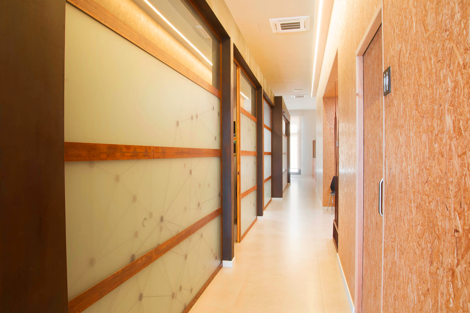 Los espacios de despachos y salas de firmas los concebimos como un volumen más bajo que el resto del local, en pequeños boxes articulados a través de un distribuidor que discurre por un lateral dando acceso a estas salas. Por su parte, este distribuidor se entiende como una espina central que recorre toda la longitud del local, realizado con unas dimensiones estrechas que van ensanchándose en zonas puntuales generando lugares de estancia, como la recepción, la sala de espera, los aseos, la sala de reuniones, etc
