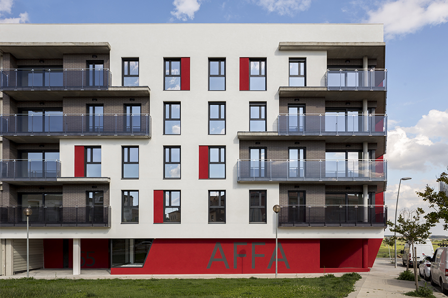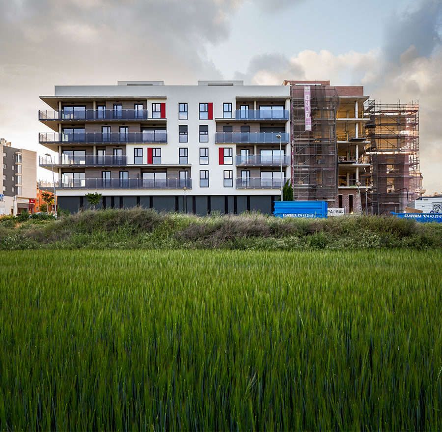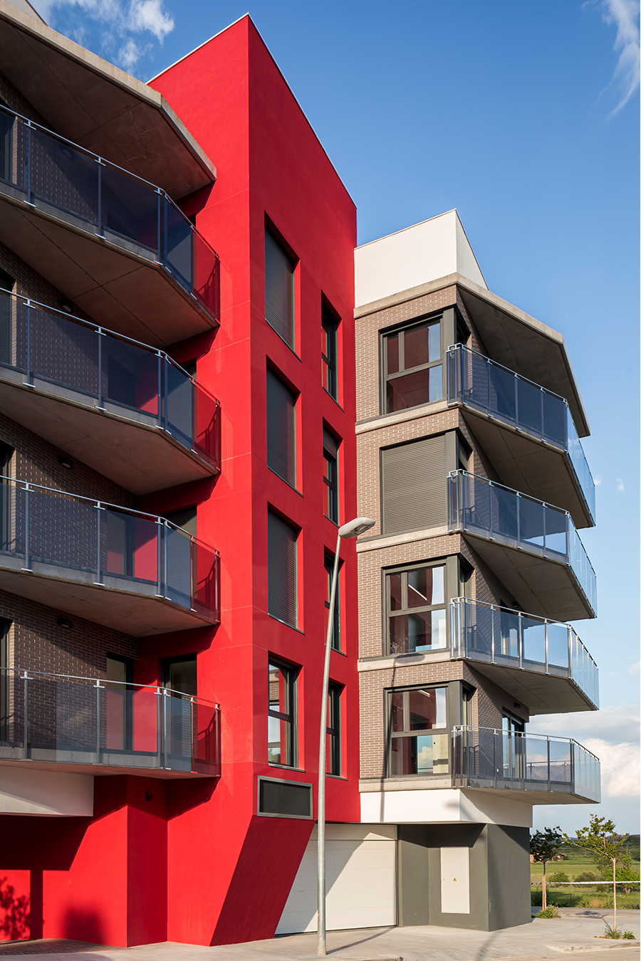 Como solución compositiva, se ha optado por evidenciar la composición funcional del edificio, destacando las dos pastillas desfasadas Este-Oeste, destacando la zona central mediante la aplicación de color. Por otro lado, se ha realizado en los alzados principales un tratamiento especifico en “bandas” de distintas dimensiones y posiciones, marcadas mediante la aplicación de distinto material, que integran los salones, balcones volados y algunas habitaciones, de modo que se introduce en dichos alzados una composición variable y heterogénea, que sirve para enfatizar la componente horizontal del edificio (por la composición en bandas), y por otro ayuda a caracterizar la variedad tipológica en la plantas y viviendas en ambos alzados.