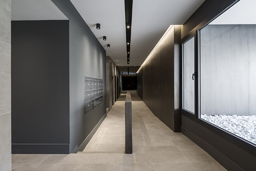 Como respuesta al condicionante geométrico de la parcela, se ha proyectado un “doble bloque”, uno de ellos orientado a Oeste (calle Benito Coll), y el otro a Este (calle Ribagorza); la zona central del edificio se destina a las zonas comunes, instalaciones, núcleos verticales de acceso y un patio central para iluminación y ventilación.