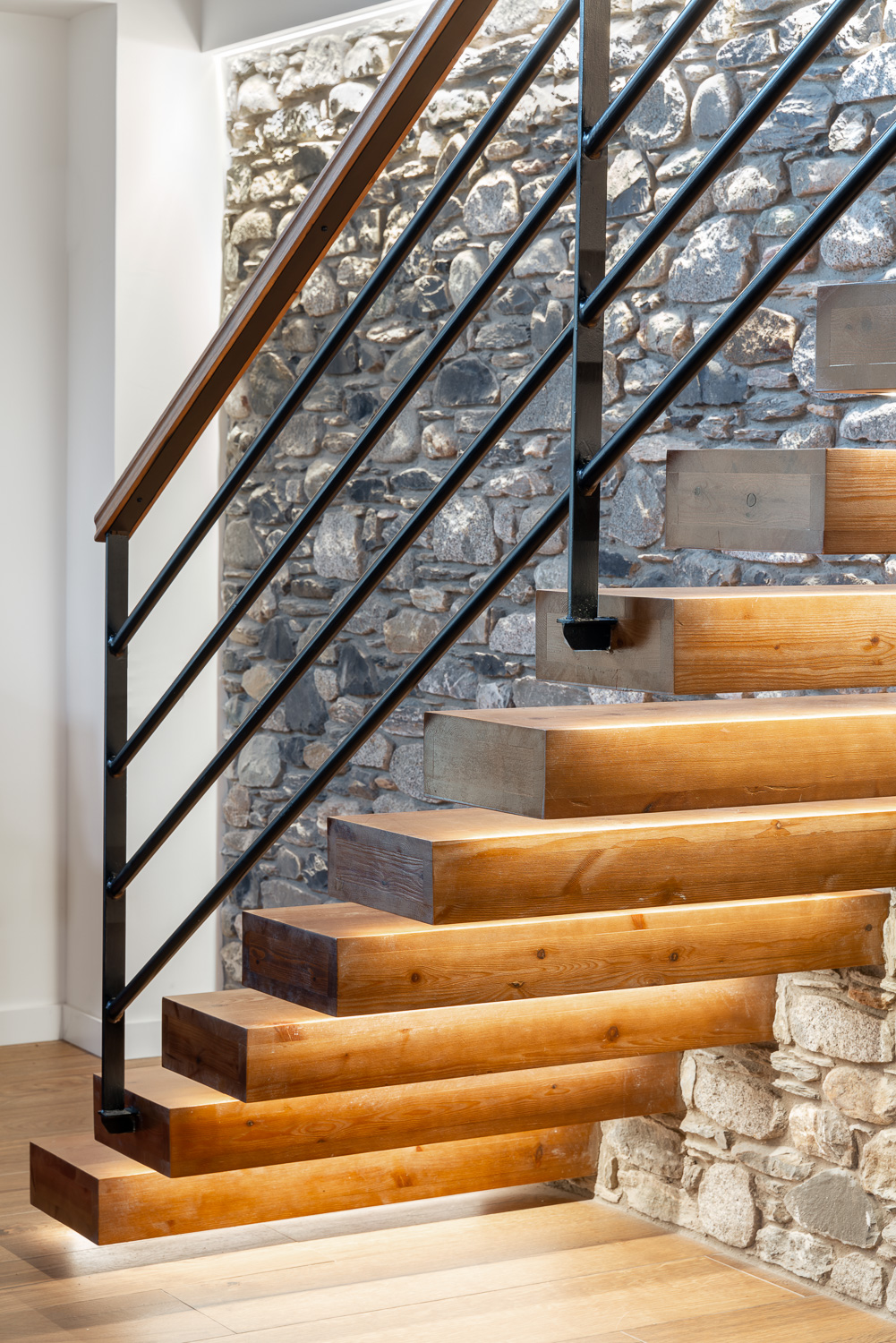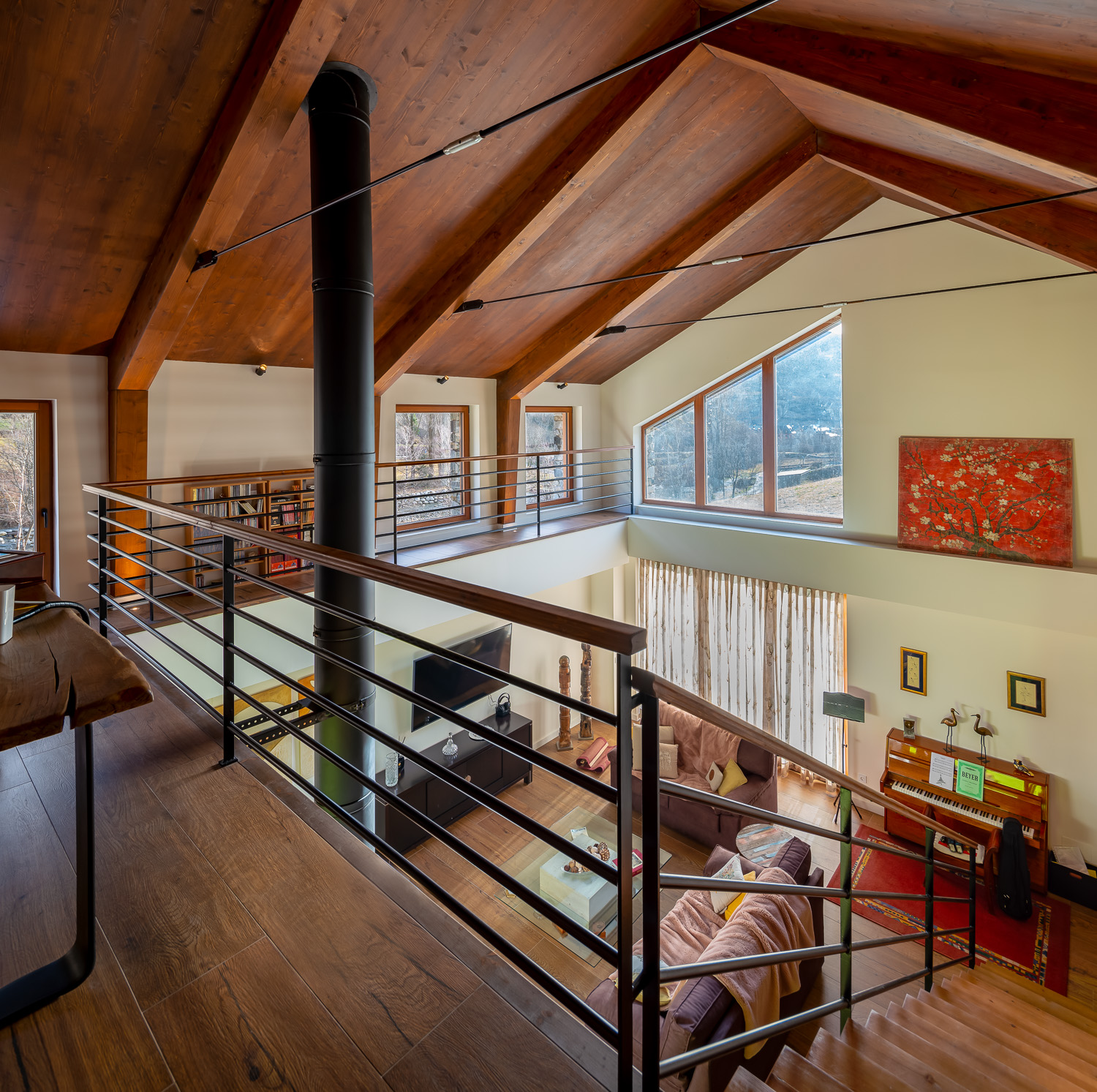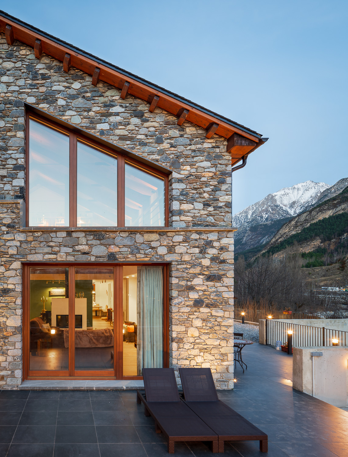 Exteriormente destaca el material protagonista de la zona, conocido como “piedra del país”. La importancia de los tejados de madera característicos del Pirineo se muestra en esta vivienda. Se proyectan unas “costillas” de madera que aparecen exteriormente en planta bajo cubierta para sostener el alero. Estas marcan la secuencia de cerchas interiores, también de madera, sobre las que se apoya el tejado. En el espacio entre costillas se abren los huecos de ventana de forma estratégica hacia las vistas y la orientación sur-este, para captar el aporte energético solar que necesita la casa.
